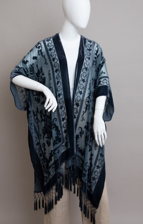 LETO ~Ornate Velvet Slate Blue Mesh Tapestry Tassel Kimono